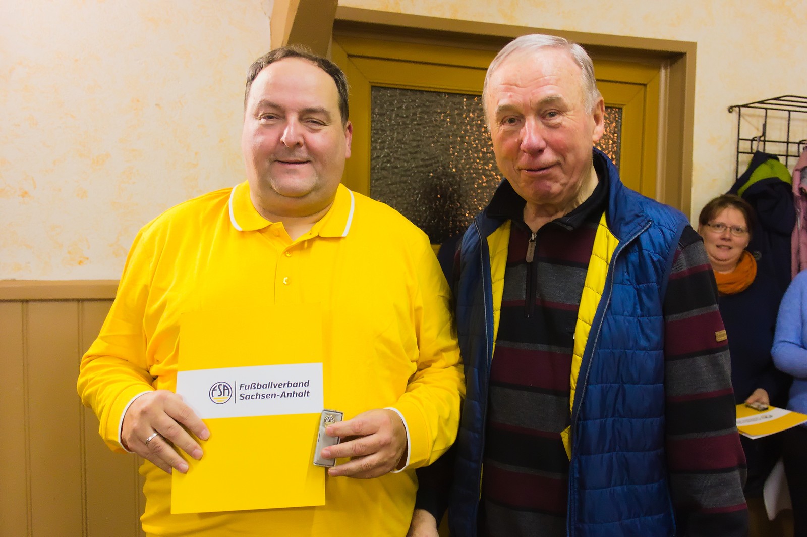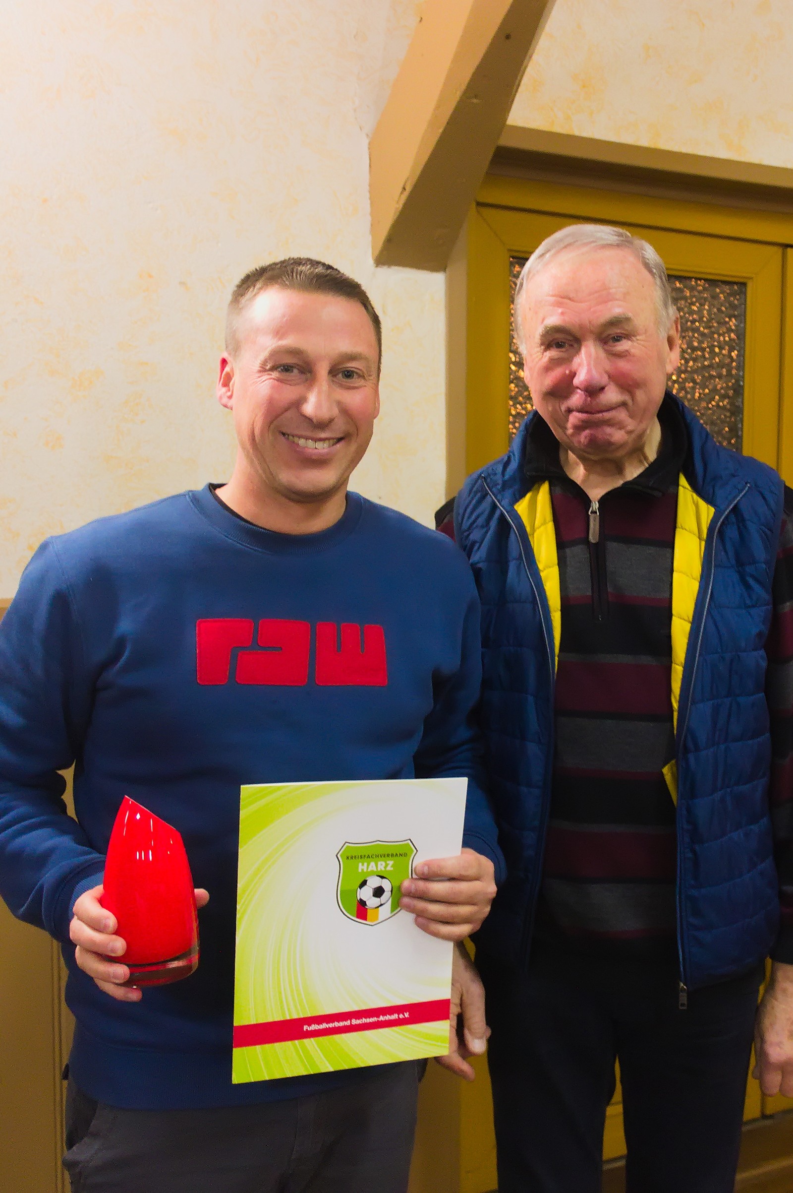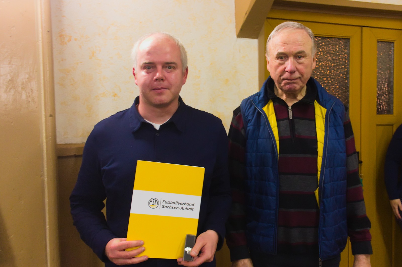 Es war schon was ganz Besonderes, als der SR-Obmann des Fußballverbandes Sachsen-Anhalt, Markus Scheibel, am Ende der Obleute-/Lehrwartetagung in Neugattersleben um Ruhe bat. Zusammen mit dem Harzer SR-Obmann Alexander Lück nahm er auf Vorschlag des Schiedsrichterausschusses und Präsidiums KFV Harz eine hochrangige Ehrung vor.